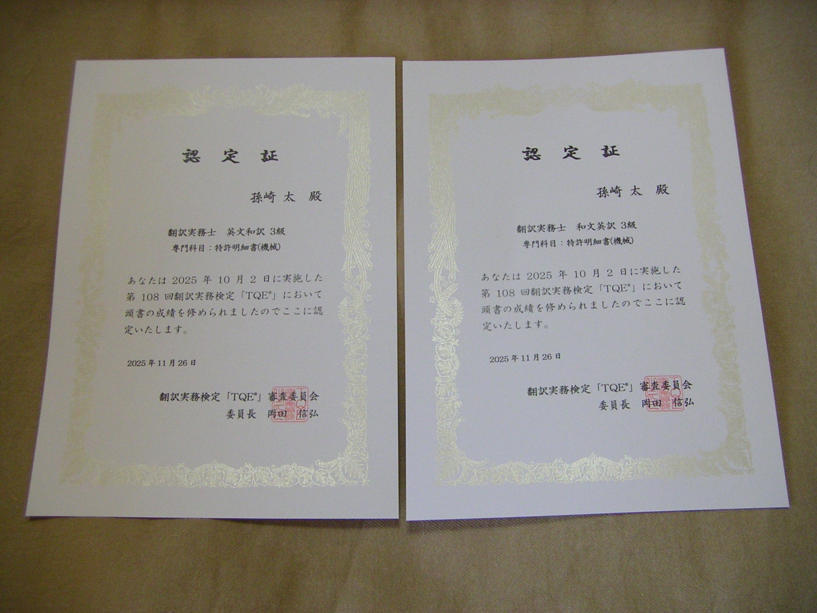 2025年12月18日 / 最終更新日時 : 2025年12月18日 magosaki 参考 特許明細書の翻訳実務士に合格しました。 2025年10月に実施された第108回翻訳実務検定(TQE)において,機械分野における特許明細書の英文和訳および和文英訳の両方に合格しました。 認定証