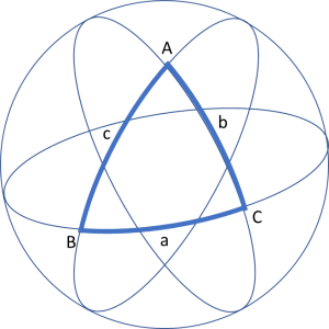 球面上の三角形について成り立つ「球面三角法」の主要な公式(余弦定理,正弦定理など)をまとめました.9頁,図7